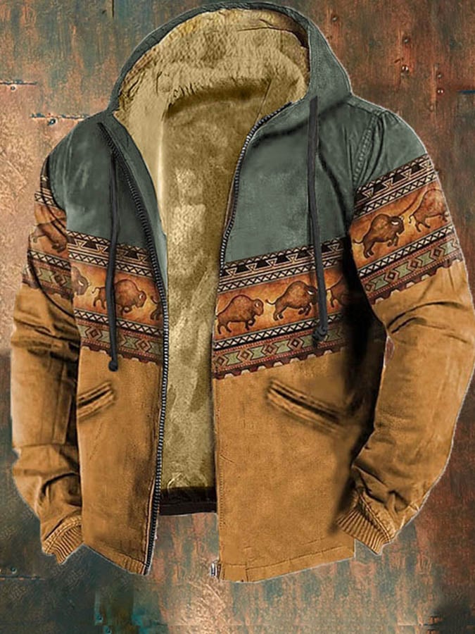 Men'S Retro Western Print Cotton Zipper Outerwear$43.59 USD -