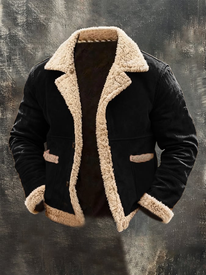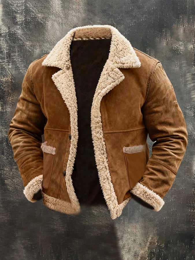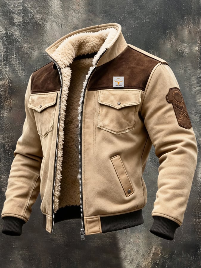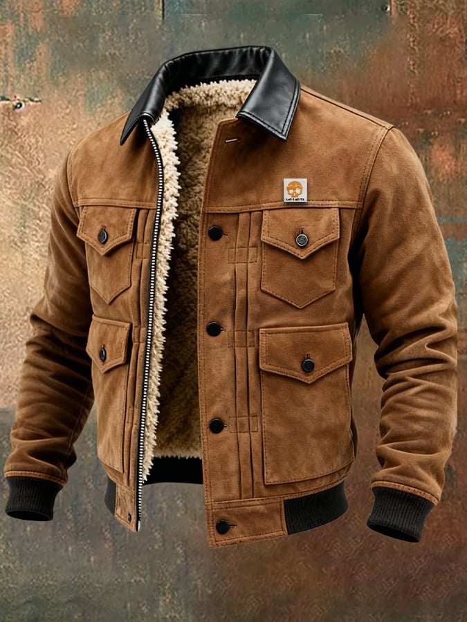 Men's Retro Suede Patchwork Multi-Pocket Fleece-Lined Outdoor Jacket$65.45 USD -