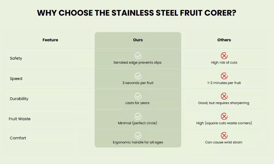 Don't Wait - Transform Your Fruit Prep Today!Say goodbye to knife cuts, wasted fruit, and tedious prep work. Experience the satisfaction of perfect fruit coring in seconds!